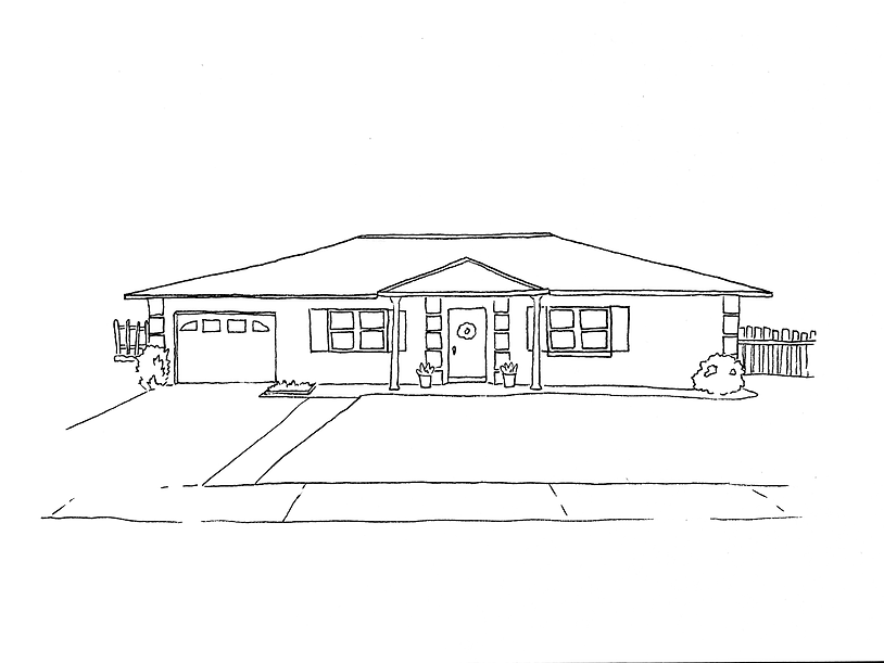 Using one main image and multiple reference photos, I adjust the angle and refine which details to include or leave out. For example, I can remove a tree to reveal more of the home, or omit any temporary damage. I work in brown colored pencil instead of ink for soft, expressive lines, and I don't use rulers or straightedges; I prefer drawing freehand to create lines that feel lively and organic.