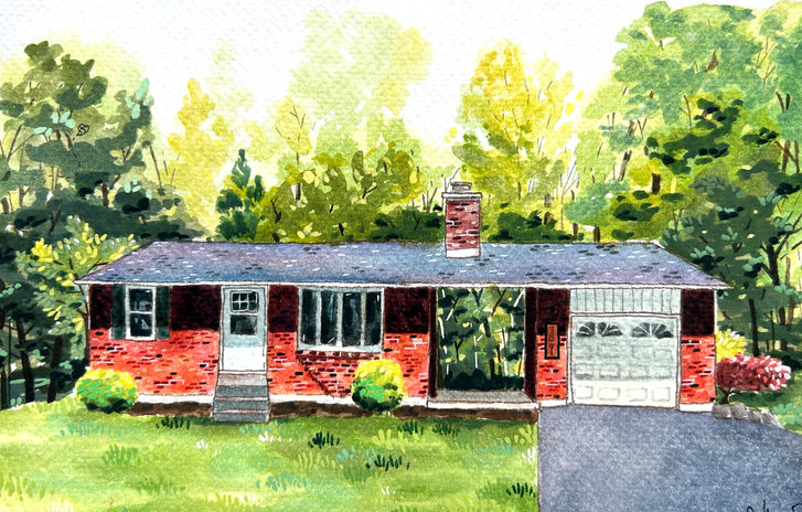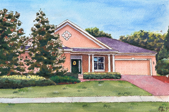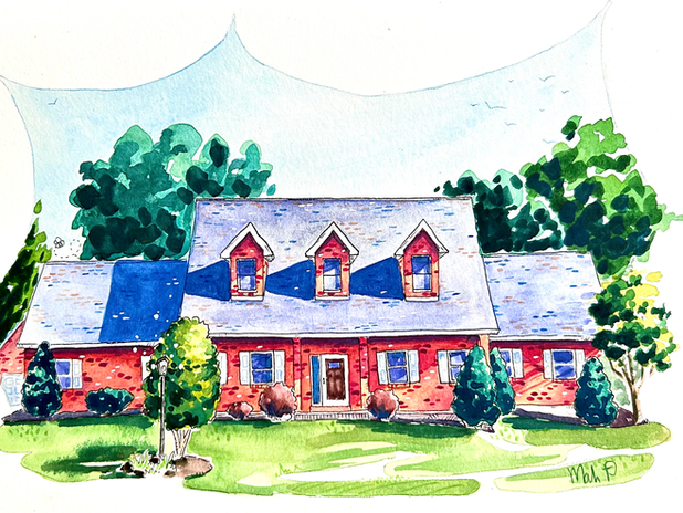 Once the drawing is complete, I begin bringing the house to life with watercolor. I work in rich, saturated colors and intentionally push the contrast so the details feel vivid and inviting. The painting develops through multiple layers, starting with broad washes that set the overall mood, then gradually building depth and texture.